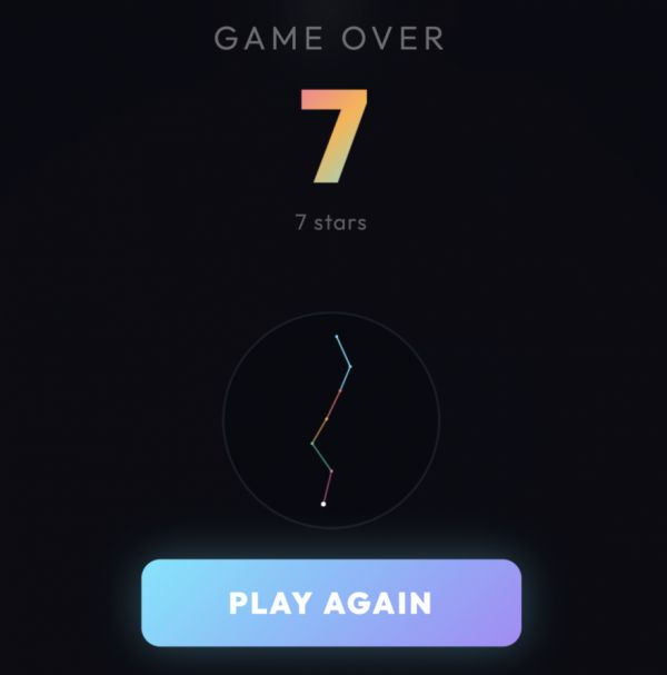 The caveat is that the game is over as soon as you miss, but you can start a new game quickly. And you will have to restart a few times before you figure it out. Yeah, a missed shot "falls" to the ground, but hey, it's just a game. I honestly hit eight stars once, but I can't prove it. Those who know say that it's slower and easier on a mobile device, and I was playing on a desktop. Also, I didn't want to play all day before I posted this, so rest assured that you can beat my score if you fool around with this for a while. I found that getting a screenshot of the action was impossible, so all I can show you is my score. I'd like to see the finished star pattern of someone who hit many more stars. -via Metafilter